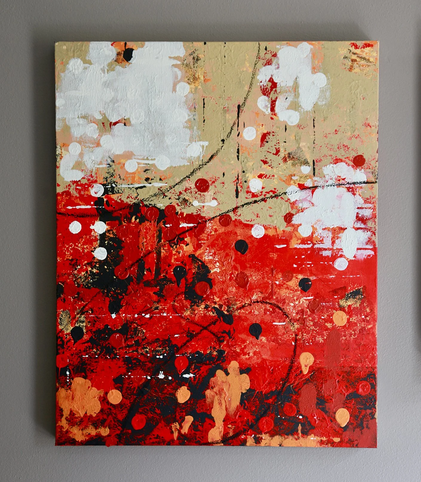 This painting came near the end of the period, when I was starting to bring more energy and looseness back into the work. I used found tools, including wine corks, to stamp and build the surface, letting repetition, accident, and texture carry more of the composition. What interested me here was not polish, but a more physical and instinctive kind of rhythm. The piece was commissioned by a client who wanted something festive and energetic, and this felt like a natural place for it to land.