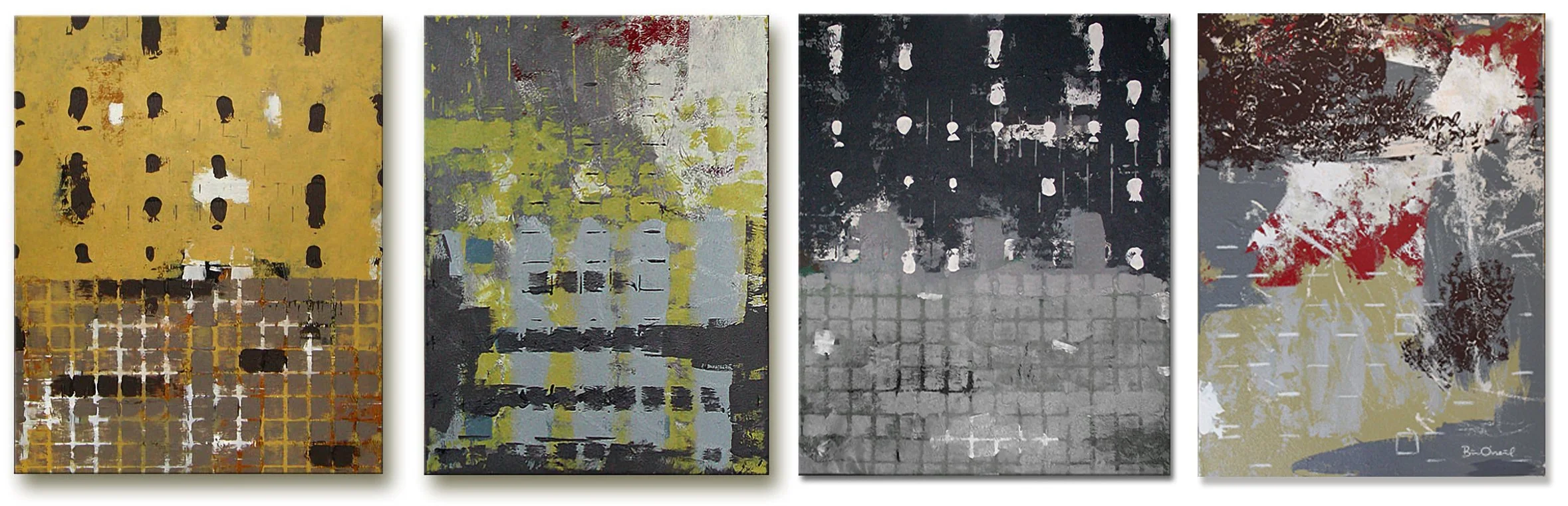 This period or evolution in style grew out of both instinct and reaction. After the more exposed inner dialogue of earlier work, I became interested in a different kind of language, less confessional, more structural. At the same time, my professional design work was exerting a much stronger influence on the art. I moved back and forth between painting and digital work, exploring geometry, texture, repetition, found tools, and more controlled surfaces. What emerged was less about expression alone and more about building order, tension, and rhythm through form.